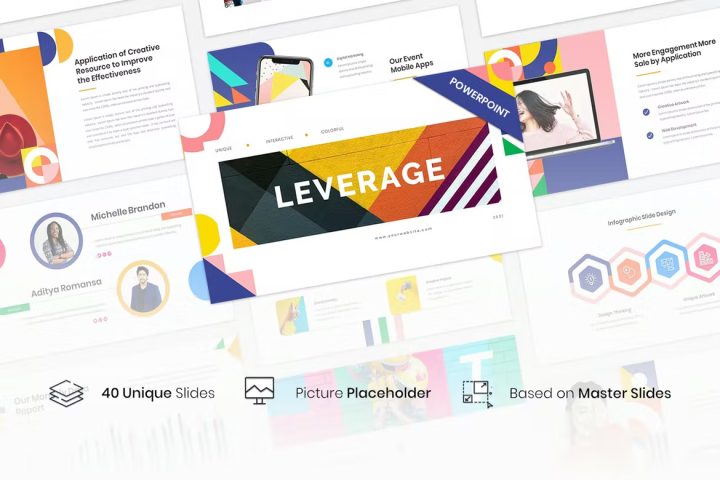 Leverage – Color Geometry PowerPoint Template is a powerpoint template that can be used for any type of presentation: Business, Portfolio, Corporate, Branding, Advertising, Creative, Art, Geometry Project and also can be used for Custom Production.