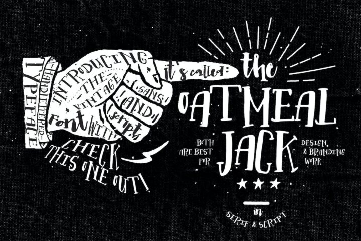 Oatmeal Jack is a dynamic, script & serif hand lettered typeface, created manually using brush and marker. With 2 styles in the family, you can mix font to create vintage badges & stickers, greeting card title, signature for design work, badge and sticker, logo and return address, some cover design and so forth, you decide!