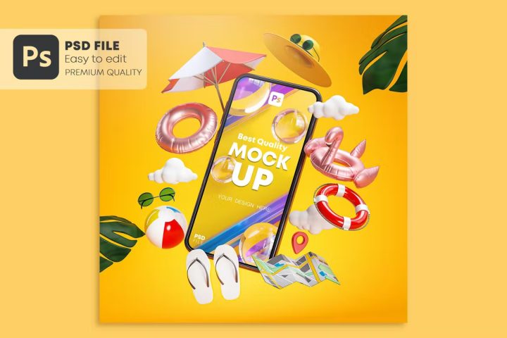 Phone, Mockup, Summer, Holiday, Accessories, 3d, Yellow, Beach ,Cute ,Screen ,Leaf ,Tropical, Travel ,Concept ,Tour, gfx