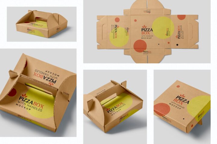 5 different perspectives of pizza box with handle mockups to present your packaging designs on all visible sides of the box. Featuring smart object option to change the design with your choice. These mockups also offer smart layers for the personalization of shadows, light effects and background effectively.