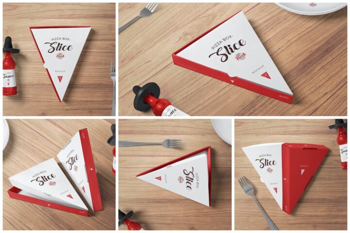 Fully customizable pizza slice box mockups for your pizza packaging and branding designs. These pizza box mock ups are best to show your one piece packing box design. These box mock ups offer sauce bottle and plate placed on a wooden table. You can add your design to these mockups using smart object feature and can customize anything in these mockups using well-named layers.