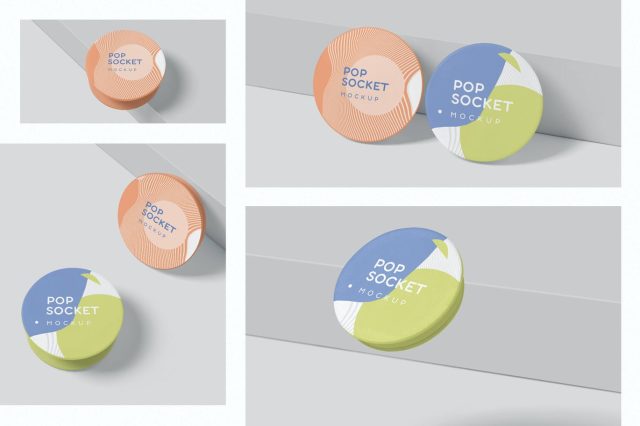 Premium quality pop socket mockups that will show any of your mobile back pop socket holder design. These mockups offer different angles to showcase your designs. You can use smart objects and well-named layers to personalize the designs, colors, effects, shadows and the background.