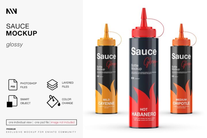 Present your design with this Sauce Bottle Mockup (Glossy) before printing. The file includes seperate layers for the color objects and background. Smart layer for the label helps to apply your design. Premium quality and simle to use.
