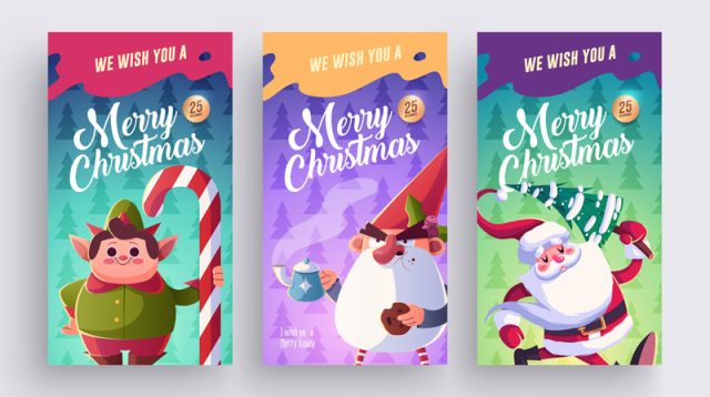 Set of merry christmas and happy new year greeting cards design with christmas characters.