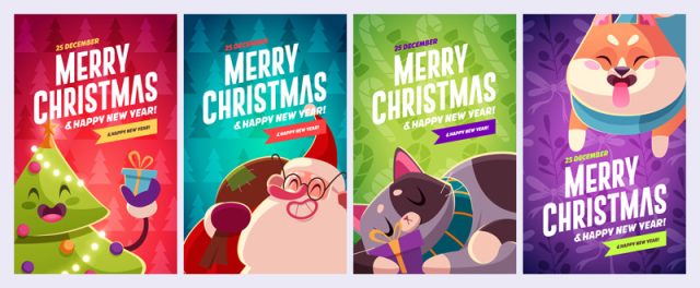 Set of merry christmas and happy new year greeting cards design with christmas characters