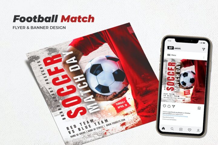 Football Match Social Template Creative and modern Instagram template to make your Instagram feed better and stand out. This flyer template perfect for any personal or corporate use. You can easily edit this flyer template. You can change the image with the smart object. You can resize all objects without reducing the image quality.