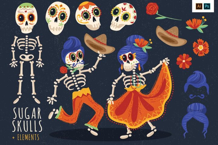 Here we have a fun & playful cartoon-style set of Mexican Calaca illustrations, aka “Sugar Skulls”.