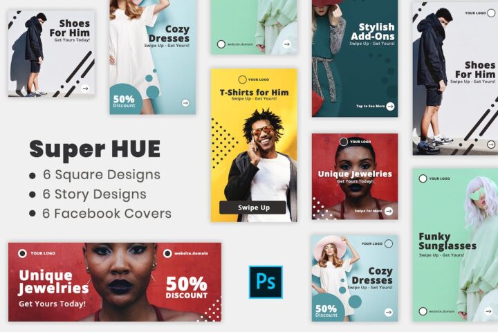 Meet Super Hue – A Collection of 18 Templates perfect for your next social media marketing campaign! The Kit includes 6 Story Designs, 6 Instagram Posts & 6 Facebook Covers. Grab the attention of your followers and emphasise your products in a unique way!