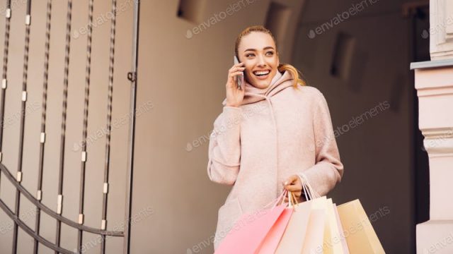Young woman talking on phone after shopping in boutiques