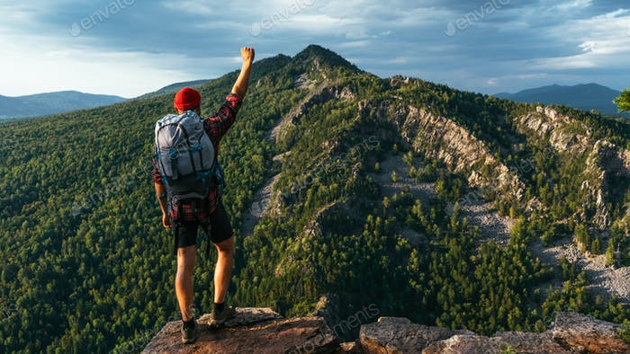 A traveler with a backpack in the mountains A man with a backpack Travel traveler backpack