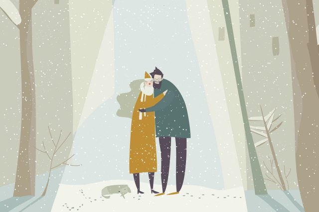 Cartoon couple in love hugging on snowing street