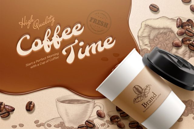 Flat lay of disposable cup with brown liquid and coffee