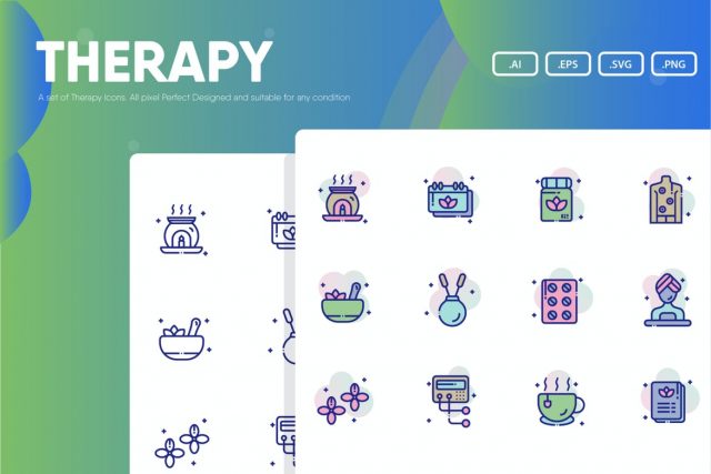 Therapy Icon Pack. This set contains 24 icons in Line Color and Outline style. Can be used for designing and developing websites, as well as printed materials and many more.