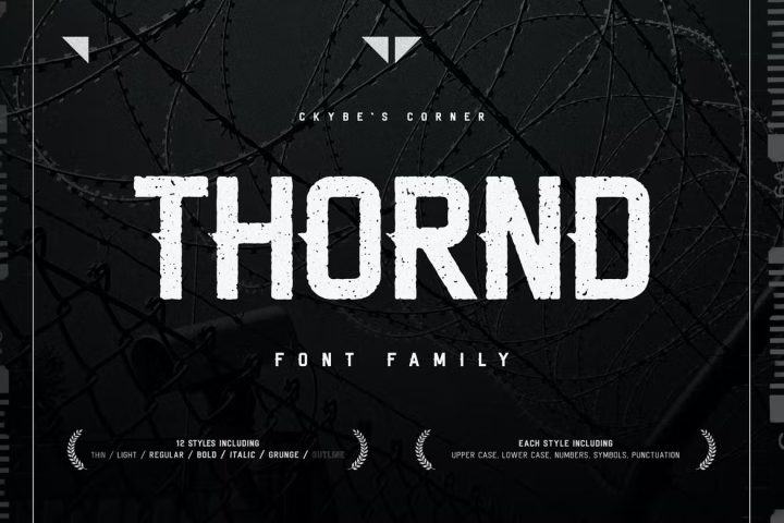 THORND Sans Serif Font Family – Strict condensed font with special thorn-element on each letter of the upper case to make it more powerful. Twelve styles including THIN, LIGHT, REGULAR, BOLD, GRUNGE, OUTLINE. Each style has an Italic version. Each style including letters in Upper Case, Lower Case, Numbers, Symbols and Punctuation.