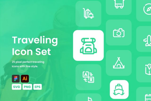 The traveling icon set can be used for all purposes, such as websites, banners, posters, UI design, and many more.
