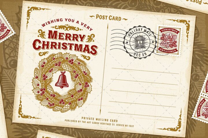 Christmas, Vintage, Postcard, Retro, Typography, Wreath, Label, Card, Stamp, Post, Holiday, Mail, Old, Woodcut, Engraving,