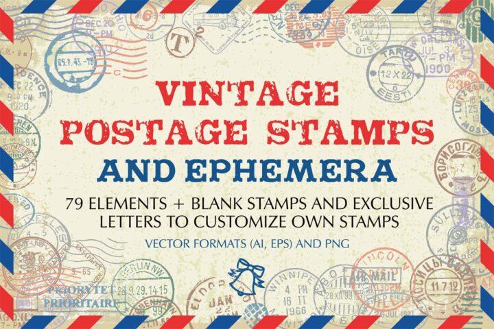 Big set of original vintage postage stamps and ephemera from various countries. You can also create your own stamps or customize it with blank stamps and exclusive grungy letters (not a font). Stamps comes in vector formats (AI, EPS) and transparent PNG. Hope this set will nice for wide range of your design works!