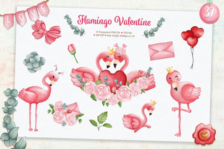 Watercolor Flamingo Valentine Illustration : All images are Digital hand painted by watercolor in PNG format with high resolution (300 dpi) with a transparent background