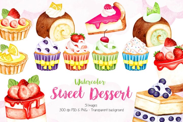 Watercolor Illustration Sweet Desserts You’ will receive: 51 images 300 dpi PSD & PNG Transparent background.