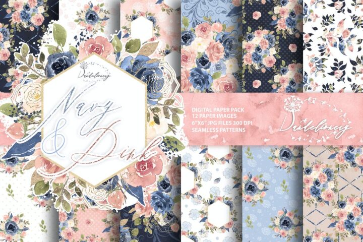 Watercolor Navy and Pink digital paper pack