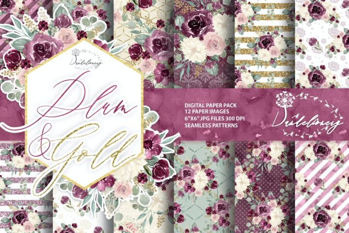 Watercolor Plum and Gold digital paper pack, Garden, Flower pattern,Flowers, Peony, roses, floral, leaves, bouquet, roses, seamless