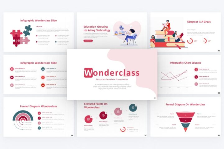 Wonderclass Education PowerPoint Template We can easily find lots of amazing presentation templates nowadays. And so, we need to shift the way we think not just to show the perfect slides, but to elevate the experience within it. Here we present to you Infographic Pack for accompanying every stage of your business development with holistic brand touchpoints, from embarking on a new project, building recognition among competitors, and finishing it with an improved goal proposition.